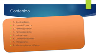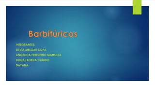 Este documento presenta información sobre los barbitúricos, incluyendo su historia, mecanismo de acción, farmacocinética, efectos terapéuticos, interacciones, efectos adversos e intoxicación. Los barbitúricos son depresores del sistema nervioso central que actúan inhibiendo los receptores GABA y prolongando la apertura de los canales de cloro, lo que intensifica los efectos del GABA. Tienen usos como hipnosedantes, agentes anticonvulsivantes y anestésicos intravenosos de acción ultracorta.