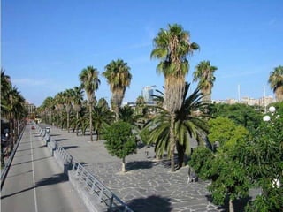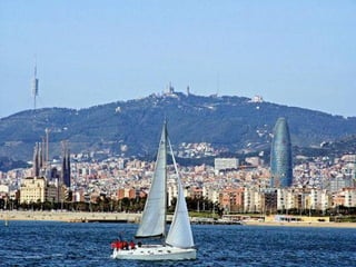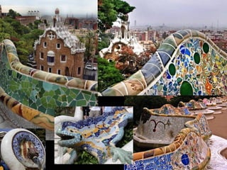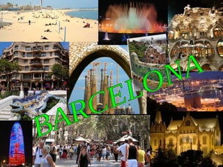 Este documento contiene una lista de lugares y atracciones turísticas en Barcelona como el Puerto Olímpico, la Playa de la Barceloneta, el Parque del Fórum, la Sagrada Familia, obras de arquitectura modernista de Gaudí, Domenech i Montaner y Puig i Cadafalch, y lugares emblemáticos como Las Ramblas, la Catedral, y vistas panorámicas de la ciudad desde el Tibidabo y Montjuïc.