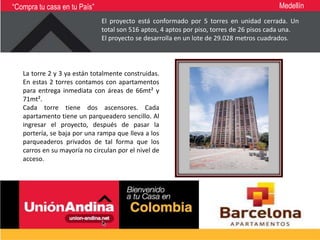Este documento describe un proyecto de vivienda en Medellín que consiste en 5 torres con un total de 516 apartamentos. El proyecto se encuentra ubicado en el sector de Ditaires en Itagüí y cuenta con zonas comunes como piscina, canchas deportivas, gimnasio y sauna. Los apartamentos tienen áreas entre 54 y 77 metros cuadrados y generalmente incluyen 3 dormitorios, baños, sala, comedor y cocina.