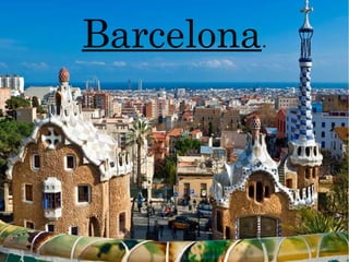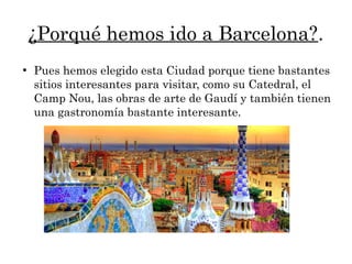 El documento habla sobre un viaje a Barcelona. Se eligió Barcelona porque tiene muchos lugares interesantes para visitar como la Catedral, el Camp Nou, y las obras de arte de Gaudí, además de una gastronomía variada. Luego enumera varios sitios turísticos como el Palacio de Montjuic, la Catedral de Sant Clau, el Teatro del Liceo y la Sagrada Familia. También menciona platos típicos como la fabes a la catalana, el pan tumaca y la escudella. Finalmente, menciona algun