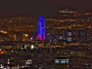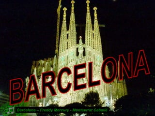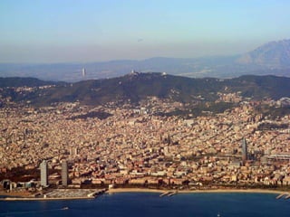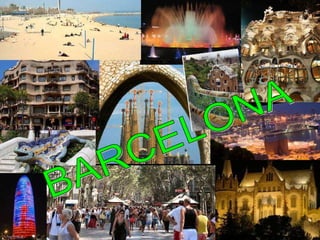 Este documento presenta una lista de lugares y atracciones turísticas en Barcelona, España. Incluye lugares emblemáticos como la Sagrada Familia, el Parque Güell y varias casas diseñadas por arquitectos modernistas como Gaudí, Puig i Cadafalch y Domenech i Montaner. También menciona playas, parques, plazas y calles principales de la ciudad, así como vistas panorámicas desde el Tibidabo y Montjuïc.