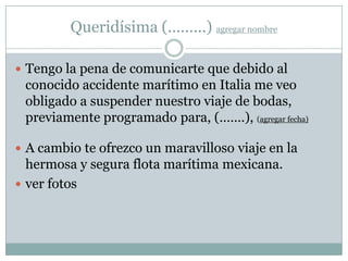 La persona cancela el viaje de bodas a Italia programado debido a un accidente marítimo reciente en ese país, y en su lugar ofrece un viaje en la flota marítima mexicana, aunque reconoce que a veces ocurren pequeños incidentes en ella. Adjunta un enlace de YouTube sobre un supuesto "Titanic mexicano".