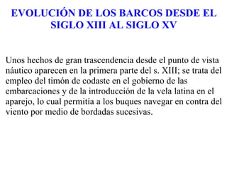 Este documento describe diferentes tipos de barcos que se utilizaron durante la Edad Media, desde el siglo XIII hasta el siglo XV. Entre los barcos descritos se encuentran las carracas, naos, carabelas, galeones, clippers, brisas o burcias, galeas, galeras y leños. Muchos de estos barcos evolucionaron para adaptarse mejor a la navegación oceánica y al comercio a larga distancia.