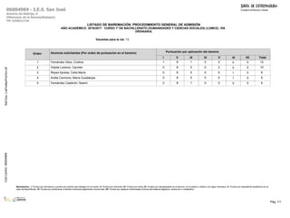 Este documento es un listado de baremación para el proceso de admisión al primer curso de bachillerato (humanidades y ciencias sociales) en el IES San José para el año académico 2016-2017. Incluye los nombres de 5 solicitantes ordenados por su puntuación total en el baremo, así como una explicación de los criterios considerados en la baremación como hermanos que estudian en el centro, domicilio, renta, discapacidad y expediente académico.