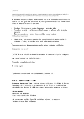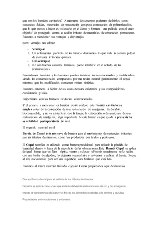 Los barnices cavitarios son sustancias fluidas que forman una película protectora en el diente para aislar la cámara pulpar de cualquier irritación química. Proporcionan un sellado perfecto de los túbulos dentinarios. Algunos barnices comunes son el barniz de copal, el copalite y el Clinpro White Varnish, que ayudan a prevenir la sensibilidad, la caries y la erosión. Las resinas cavitarias modificadas como el Cavisol brindan propiedades adhesivas como material de obturación temporal.