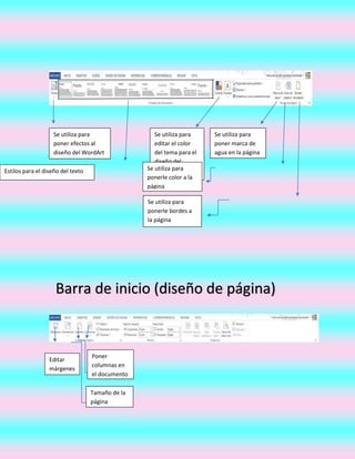 Este documento describe las diferentes herramientas y funciones disponibles en Microsoft Word para editar texto, insertar elementos como imágenes y tablas, cambiar el formato y estilo de la letra, diseñar páginas e insertar gráficos y encuestas. Se mencionan opciones como cambiar el tamaño y tipo de letra, usar negrita, alinear texto, pegar contenido, insertar formas, tablas e imágenes, y editar márgenes, columnas y el tamaño de página.