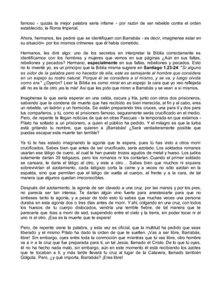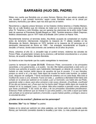 El documento describe la historia bíblica de Barrabás, un prisionero famoso que fue liberado en lugar de Jesús durante el Juicio de Poncio Pilato. Representa a todos los seres humanos, condenados por el pecado, que son liberados de la muerte a través del sacrificio de Jesucristo en la cruz. La historia de Barrabás ilustra cómo Jesús murió en lugar de la humanidad, liberándonos del pecado y dándonos vida eterna por gracia mediante la fe.