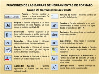 El documento describe las funciones de las barras de herramientas de formato en Microsoft Word. Estas incluyen opciones para formato de fuente como tamaño, estilo, color y alineación. También incluyen opciones para formato de párrafo como viñetas, numeración, sangría, bordes, sombreado y alineación. En total hay 234 fuentes disponibles y 16 estilos de bordes.