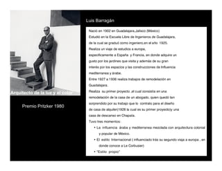 Luis Barragán fue un arquitecto mexicano galardonado con el Premio Pritzker en 1980. Tuvo tres etapas estilísticas principales - influenciado por la arquitectura árabe y mediterránea, el Estilo Internacional luego de un viaje a Europa, y finalmente desarrolló su propio estilo caracterizado por el uso de elementos tradicionales mexicanos. Algunos de sus proyectos más destacados incluyen la Casa González Luna, la Casa para dos familias, su Casa Estudio y las Torres Satélites.