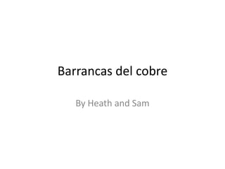 El documento habla sobre las Barrancas del Cobre en el estado mexicano de Chihuahua. Brevemente describe la ubicación de la región, el río Fuerte que la atraviesa, el tren que conecta la zona, la etnia indígena Tarahumara que habita allí, el clima árido y la comida típica como el guiso de cabrito. También menciona la cascada Piedra Volada, una de las atracciones naturales de la región.