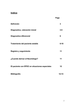 Este documento proporciona información sobre la enfermedad pulmonar obstructiva crónica (EPOC), incluida su definición, diagnóstico, evaluación inicial, diagnóstico diferencial, tratamiento de pacientes estables y situaciones especiales. Cubre temas como síntomas, espirometría, clasificación de gravedad, educación del paciente, vacunación, tratamiento farmacológico con broncodilatadores, corticoides y otros, y criterios para oxigenoterapia domiciliaria. El objetivo general del tratamiento es evitar la