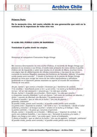 Este documento resume un discurso sobre el marxismo latinoamericano y la generación rebelde de los años 80 en Chile. Habla sobre la canción "El pueblo unido jamás será vencido" de Sergio Ortega y su importancia para expresar la lucha del pueblo chileno. También critica cómo el estado se ha alejado de defender a los oprimidos bajo el neoliberalismo y cómo el pensamiento marxista aún puede ofrecer ideas para la filosofía política y la teoría social.