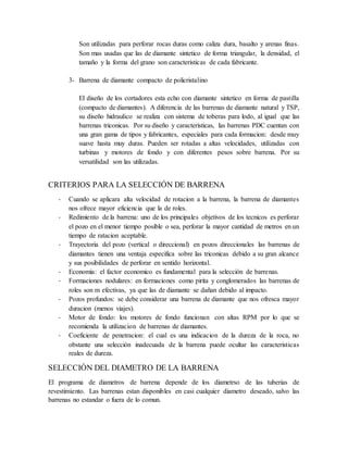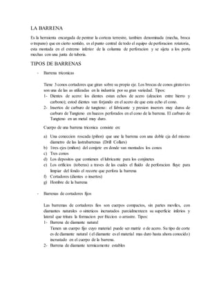 La barrena es la herramienta que perfora la corteza terrestre y se monta en el extremo de la columna de perforación. Existen dos tipos principales de barrenas: barrenas triconicas con tres conos cortadores giratorios y barrenas de cortadores fijos con diamantes incrustados. Al seleccionar una barrena se consideran factores como la velocidad de rotación, rendimiento, trayectoria del pozo, economía y formación a perforar. El diámetro de la barrena depende del diámetro de las tuberías