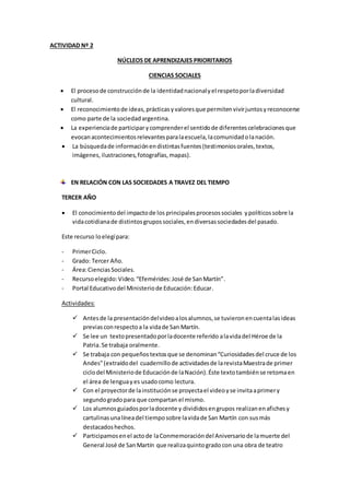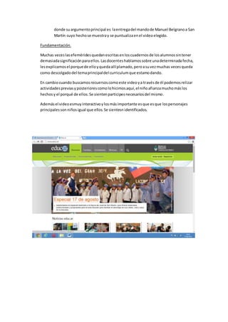 Este documento presenta los objetivos de aprendizaje en ciencias sociales para tercer año, incluyendo el proceso de construcción de la identidad nacional y el respeto por la diversidad cultural. Luego describe las actividades realizadas en torno al video "Efemérides: José de San Martín", con el objetivo de enseñar sobre la vida y logros de San Martín de una manera significativa e interactiva para los estudiantes. Finalmente, fundamenta la elección de este recurso para involucrar a los estudiantes y ayudarlos a comprender mejor los hech