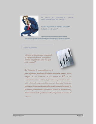 El documento resume 10 barreras comunes para emprender un negocio: 1) falta de una idea de negocio viable, 2) falta de experiencia en el sector, 3) falta de formación empresarial, 4) falta de financiación, 5) creencia de que el carácter emprendedor es innato, 6) temor a la dureza de los primeros meses, 7) barreras específicas para determinados grupos como jóvenes o mujeres, 8) percepción de que es demasiado arriesgado, 9) percepción de que es demasiado complicado, y 10)