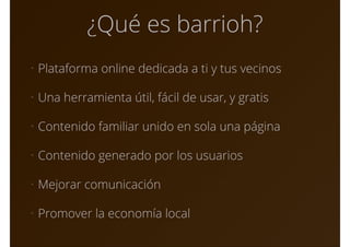 Este documento presenta Barrioh, una plataforma online gratuita dedicada a mejorar la comunicación y promover la economía local entre vecinos. Los usuarios pueden publicar anuncios, participar en foros, ver eventos en la agenda pública, y encontrar comercios y servicios locales. El objetivo es complementar las redes sociales existentes para convertir Barrioh en un hábito diario y recurso útil para la comunidad.