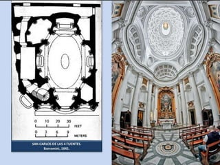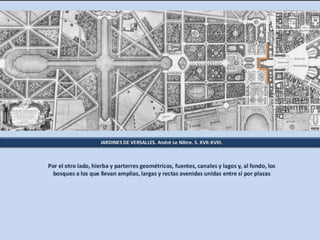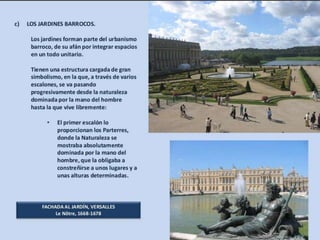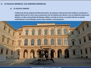 El documento describe tipos de viviendas barrocas, destacando el palacio como edificaciones urbanas de familias poderosas, caracterizadas por sus dinámicas fachadas. También menciona el Hôtel des Invalides en París como un ejemplo de vivienda burguesa rodeada de jardines. Además, se hace referencia a puertos y plazas relacionadas con actividades comerciales y culturales en diferentes ciudades europeas.