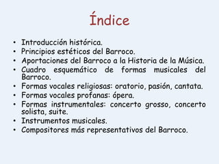 El documento presenta una introducción histórica al período barroco, que abarcó el siglo XVII y primera mitad del XVIII. Explica los principios estéticos del barroco como el contraste, movimiento y tensión, así como las aportaciones a la música como la ópera y nuevas formas instrumentales. Finalmente, resume las principales formas musicales vocales y instrumentales del período barroco y los compositores más representativos como Bach, Händel, Vivaldi y Monteverdi.