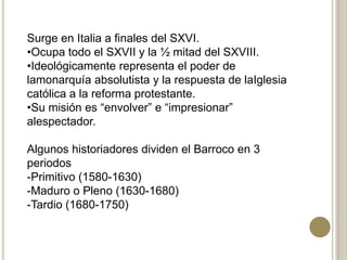 El estilo barroco surgió en Italia en el siglo XVI y se extendió durante los siglos XVII y XVIII. Se caracteriza por envolver e impresionar al espectador a través de formas dinámicas, colores vibrantes y efectos teatrales. La pintura, escultura y arquitectura barrocas se desarrollaron en distintas escuelas nacionales con influencia del naturalismo y clasicismo italianos.