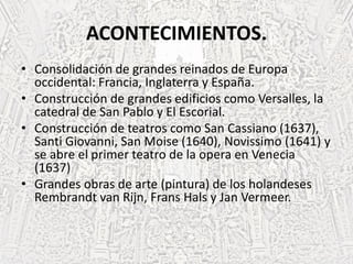 El documento resume las características principales del período barroco en Europa, incluyendo la consolidación de grandes reinados, la construcción de edificios y teatros notables, y el desarrollo de géneros musicales como la ópera y la cantata. También describe a los compositores más importantes de este período en Italia, Alemania, Francia e Inglaterra, como Monteverdi, Corelli, Vivaldi, Bach, Händel y Telemann.