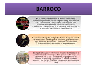 El documento describe el período barroco en España en los siglos XVI y XVII. Se caracterizó por una crisis religiosa y política, con tensiones entre la vida mundana y la religión. En literatura, el barroco representó una evolución del Renacimiento manteniendo los mismos temas pero adaptándolos a la época. Los monarcas delegaron el poder en validos que a menudo gobernaron como reyes absolutos. La expulsión de judíos y moriscos, así como la emigración a América, intensificaron el declive demográ