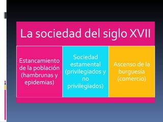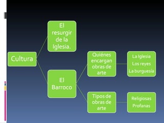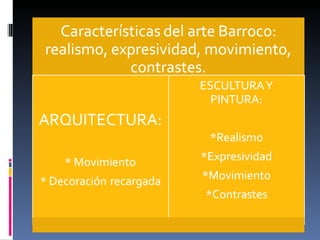 El documento describe el siglo XVII como el siglo del Barroco y de la monarquía absoluta, donde los reyes ejercían un poder divino sin rendir cuentas. Políticamente, España entró en decadencia mientras que Francia alcanzó la hegemonía. Se muestran imágenes de obras de arte barrocas de palacios, esculturas y pinturas de artistas como Bernini, Caravaggio, Rembrandt, Velázquez y otros que ilustran el desarrollo geográfico del arte barroco en el siglo XVII