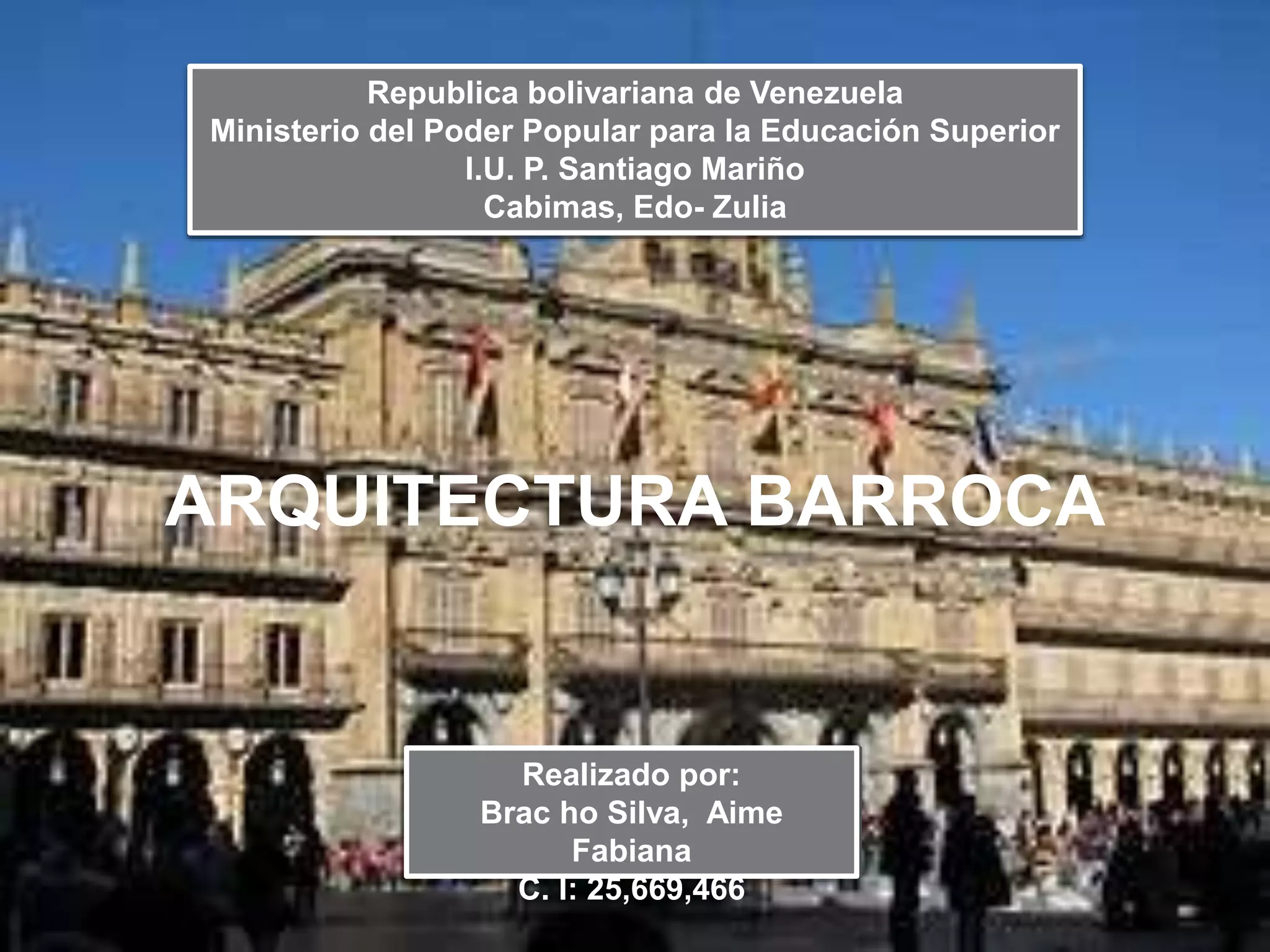 El documento resume la arquitectura barroca en varios países europeos. En Italia, arquitectos como Bernini, Borromini y Guarini crearon obras maestras barrocas en Roma y otras ciudades italianas que se caracterizaron por líneas dinámicas y curvas. En Francia, el Palacio de Versalles fue un ejemplo de la arquitectura barroca al servicio del poder absoluto del rey Luis XIV. En Inglaterra, arquitectos como Inigo Jones y Christopher Wren introdujeron el estilo barroco y crearon ob