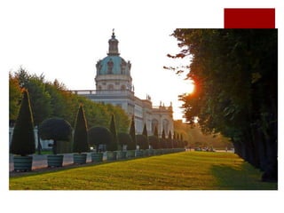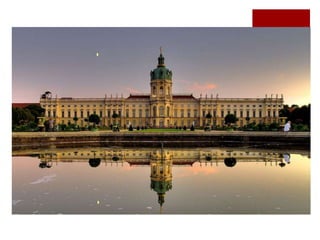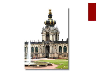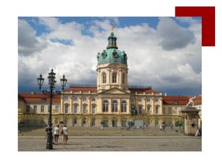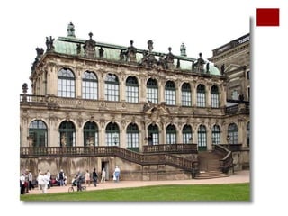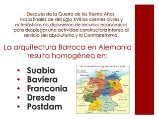 El documento proporciona información sobre la arquitectura barroca en Alemania. Después de la Guerra de los Treinta Años, la arquitectura barroca en Alemania se caracterizó por edificios con gran exuberancia y luminosidad brusca en los interiores. Los estilos arquitectónicos eran homogéneos en regiones como Suabia, Baviera y Franconia, e incluían influencias de Francia e Italia. Algunos ejemplos notables son el Zwinger de Dresde y el Palacio de Charlottenburg en