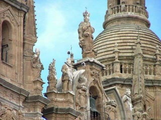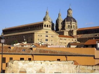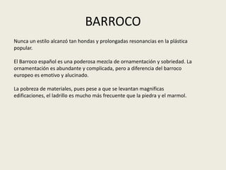 El documento resume el estilo arquitectónico barroco en España. Destaca la mezcla de ornamentación abundante con sobriedad emotiva. La madera y el ladrillo se usaron más que la piedra debido a la pobreza de materiales. Arquitectos como Churriguera desarrollaron un estilo altamente decorado. Otras obras notables incluyen el Transparente de Tomé en la Catedral de Toledo y varios palacios reales diseñados por arquitectos italianos.