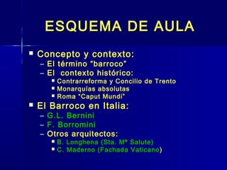 El documento resume las principales características y manifestaciones del arte barroco en Europa entre los siglos XVII y XVIII. Se describe el contexto histórico de la Contrarreforma y el auge de las monarquías absolutas. Se analizan las principales corrientes artísticas en países como Italia, España, Francia y los Países Bajos, con énfasis en arquitectos como Bernini y Borromini, y pintores como Caravaggio, Velázquez y Rubens. El documento ofrece una visión general del desarrollo del arte barroco