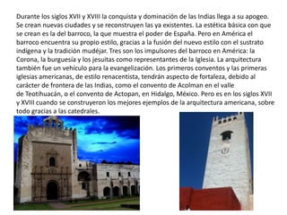 El documento describe la arquitectura barroca en Nueva España y Sudamérica durante los siglos XVII y XVIII. Detalla importantes iglesias, catedrales y conventos construidos en este estilo, incluyendo obras de arquitectos como Francisco Becerra, Francisco Antonio Guerrero y Torres, y Simón Schenherr. También describe la construcción del Templo de Santa Prisca en Taxco de Alarcón entre 1751 y 1758, financiado por José de la Borda y diseñado por Diego Durán y Cayetano Sigüenza.