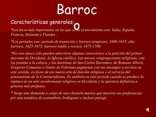 El documento resume las características y los artistas más importantes de la pintura barroca en Europa. Los focos principales fueron Italia, España, Francia, Holanda y Flandes. Artistas como Caravaggio, Rubens, Velázquez y Rembrandt se destacaron por su uso innovador de la luz y el claroscuro, composiciones dinámicas y temas religiosos y seculares. Cada país desarrolló estilos propios influenciados por la Contrarreforma o la Reforma Protestante.