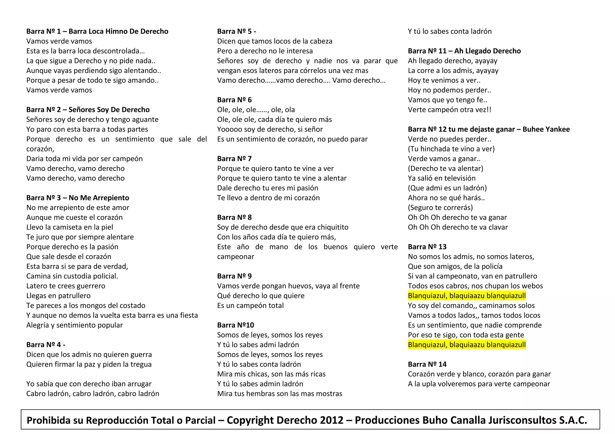 Este documento contiene 19 canciones de barra de hinchas del club de fútbol Derecho. Las canciones expresan su pasión y apoyo incondicional para el club a pesar de las derrotas, y prometen alentar al equipo para siempre. También se jactan de ser más fervientes que las barras rivales y dicen que Derecho eventualmente se convertirá en campeón.