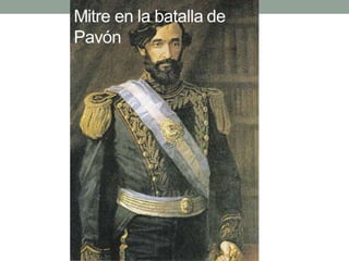 El documento habla sobre Bartolomé Mitre y su liderazgo del ejército de Buenos Aires, su presidencia, y su papel en la Guerra de la Triple Alianza contra Paraguay, la cual terminó con la derrota de Paraguay.