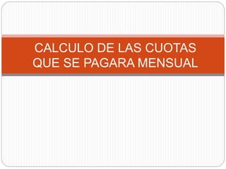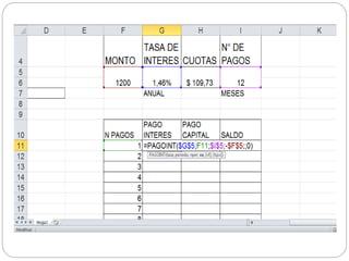 Este documento explica cómo calcular las cuotas mensuales y realizar una tabla de amortización para comprar un computador a plazos de $1,200 con un interés anual del 17.5% pagadero en 12 meses. Se recomienda crear una tabla con los datos provistos, calcular la tasa de interés mensual, usar fórmulas para determinar cada pago mensual y el saldo restante, y automatizar los cálculos para generar la tabla de amortización completa.