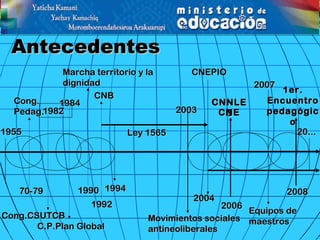 Este documento presenta una propuesta curricular para el sistema educativo plurinacional de Bolivia. Se basa en principios como la educación descolonizadora e intercultural, y tiene como objetivo lograr una formación integral de los estudiantes centrada en vivir bien en armonía con la comunidad y la naturaleza. La estructura curricular incluye campos de saberes como cosmos y pensamiento, comunidad y sociedad, entre otros, articulados a través de ejes transversales como la educación productiva e intercultural.