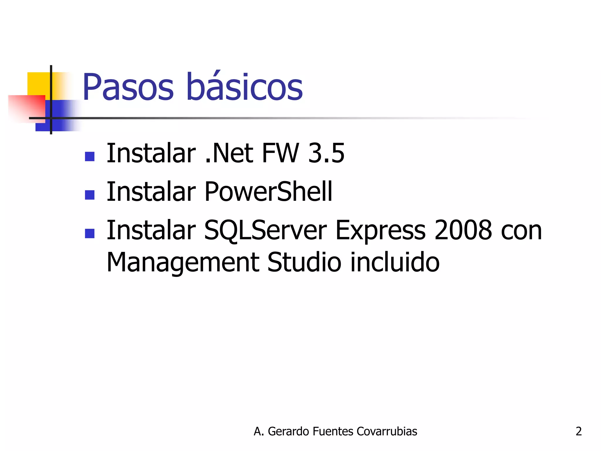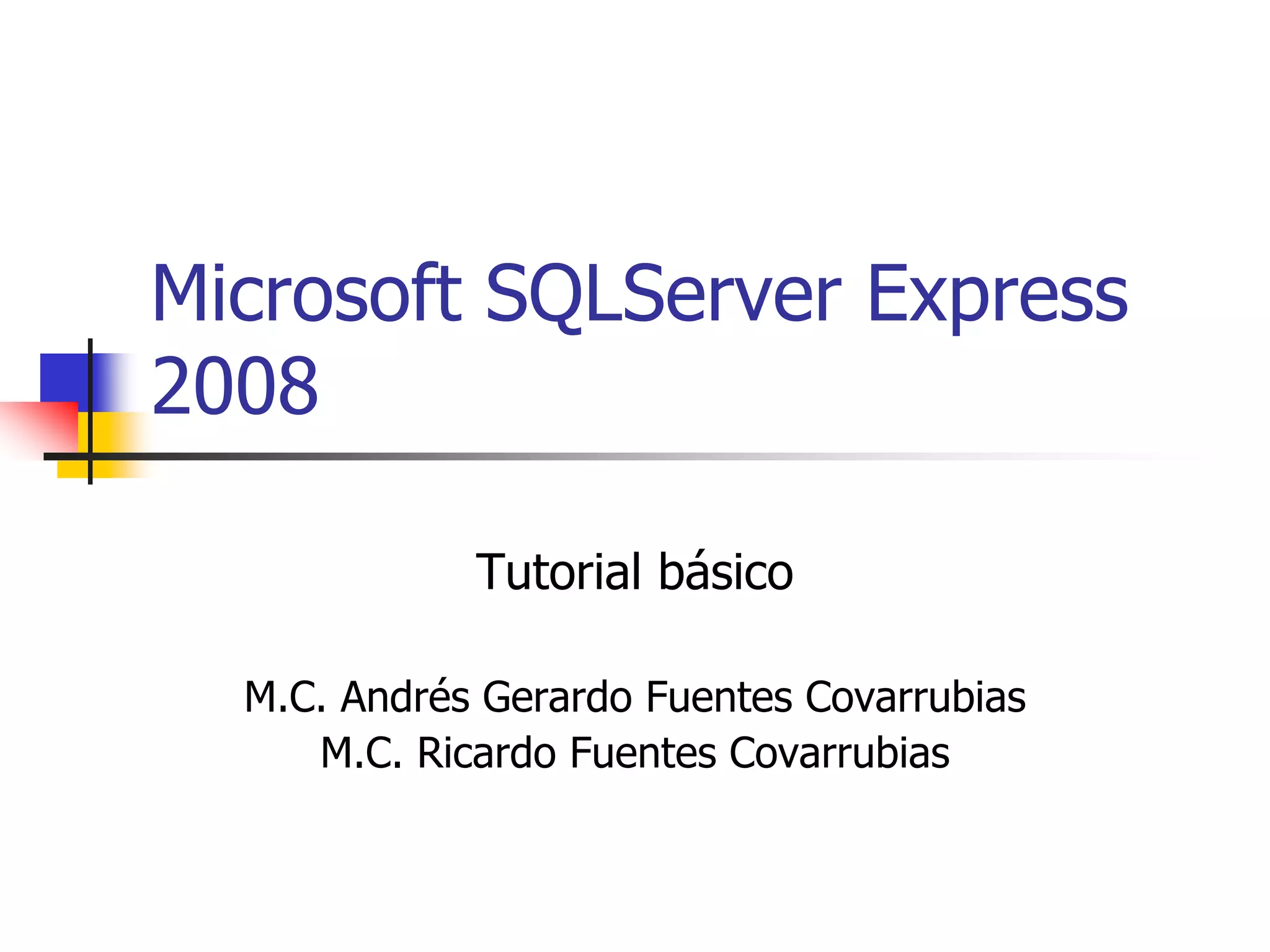 Este documento presenta un tutorial básico sobre Microsoft SQL Server Express 2008. Explica los pasos para instalar .NET Framework 3.5, PowerShell e SQL Server Express 2008. También cubre temas como el manejo de bases de datos con la utilidad sqlcmd, la creación de una base de datos y tabla relacionada, y cómo mostrar una base de datos a través de un control de rejilla.