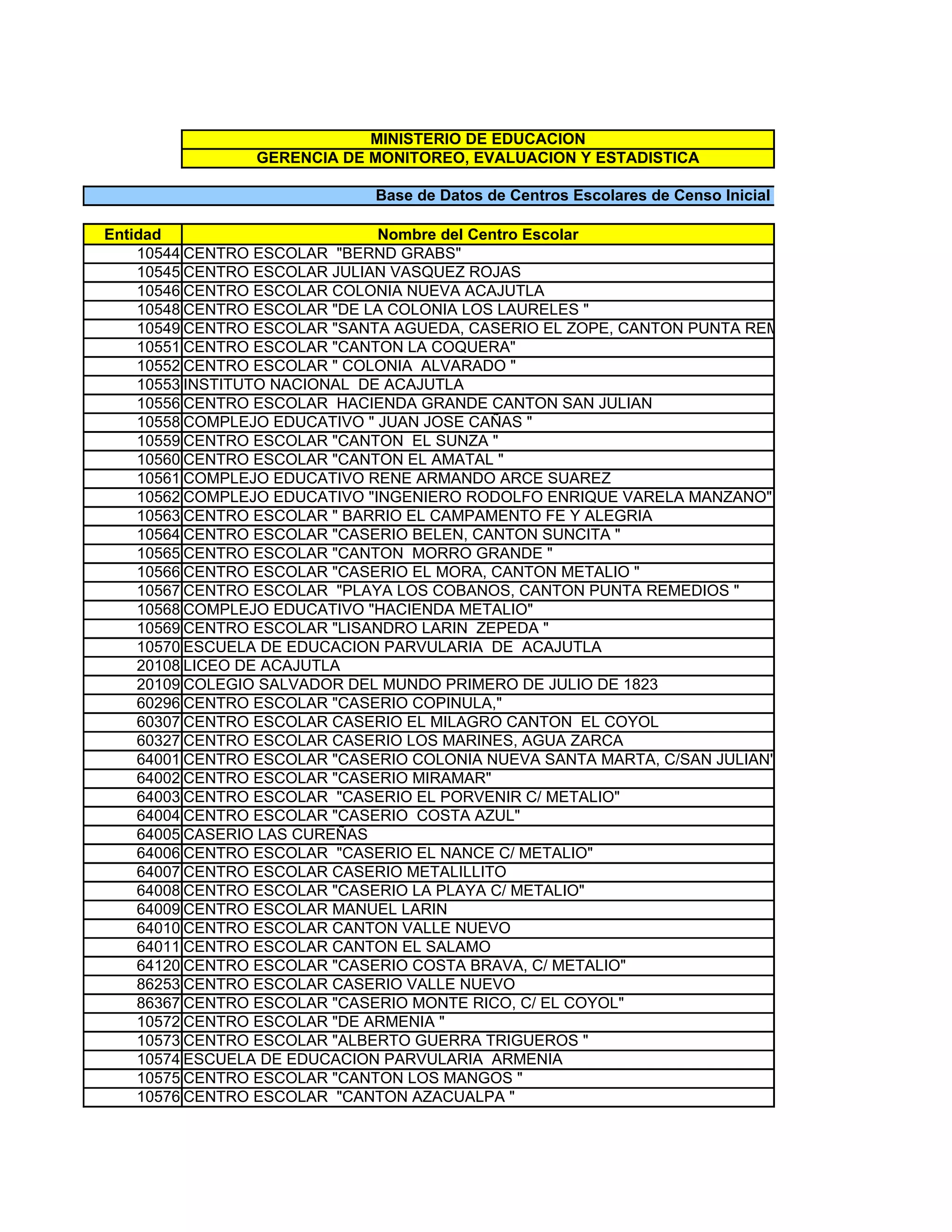 Este documento presenta una lista de 105 centros escolares de la entidad con sus respectivos nombres y códigos. La lista incluye escuelas, colegios e institutos de varias localidades de El Salvador como Acajutla, Armenia, Izalco, Juayúa y Sonsonate.