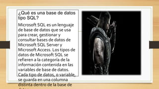 Este documento contiene información sobre diferentes tipos de bases de datos. Explica que una base de datos es un conjunto de datos almacenados sistemáticamente para su posterior uso, mientras que una base de datos SQL utiliza el lenguaje SQL y almacena datos en tablas relacionadas. También describe bases de datos NoSQL como MongoDB y Cassandra, las cuales almacenan datos de forma flexible sin esquemas fijos y son adecuadas para grandes volúmenes de datos distribuidos.