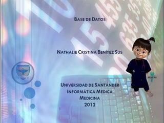 Una base de datos es un sistema de archivos electrónico que almacena datos de forma sistemática para su posterior uso. Está compuesta de tablas que contienen registros con campos de información, lo que permite organizar y compartir los datos de manera estructurada. En el área médica, bases de datos como Science Direct y Engineering Village-Compendex proveen acceso a artículos y resúmenes que apoyan la investigación y educación.
