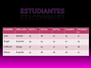 Este documento contiene tres tablas. La primera tabla muestra las notas, examen y promedio de 4 estudiantes. La segunda tabla lista 5 productos alimenticios con su cantidad y precio. La tercera tabla enumera 5 teléfonos con su código, marca y precio.