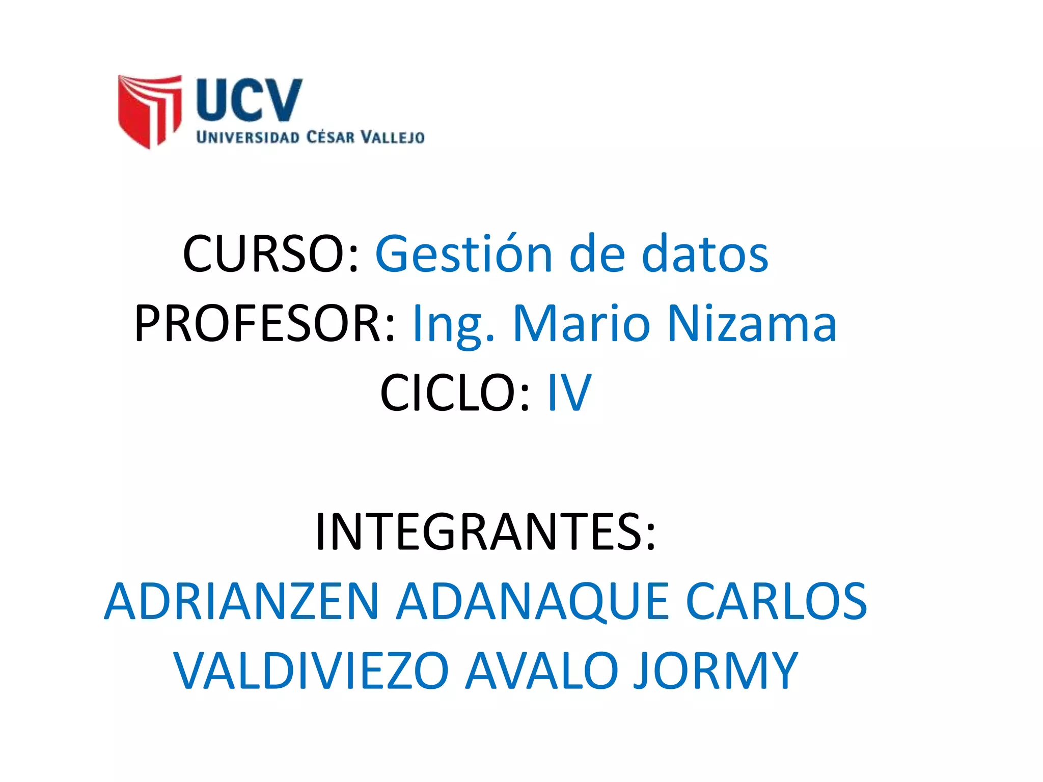 Este documento proporciona información sobre un curso de gestión de datos impartido por el Ing. Mario Nizama en el ciclo IV. El curso cubre temas como modelo de base de datos, arquitectura de base de datos y herramientas CASE para bases de datos.