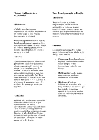 Este documento describe los conceptos básicos de las bases de datos, incluyendo sus tipos de archivos, organización, función y principales manejadores. Explica que una base de datos es un conjunto de información relacionada estructurada y almacenada en tablas formadas por filas y columnas. También cubre temas como campos, claves, índices y diferentes tipos de archivos como maestros, movimiento y de maniobra. Finalmente, menciona populares sistemas de gestión de bases de datos como Oracle, Microsoft SQL Server, Microsoft Access y la herram