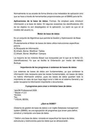 Una base de datos es un conjunto de datos estructurados y almacenados de forma independiente que permite el acceso en tiempo real a usuarios concurrentes. Un sistema de gestión de base de datos (SGBD) define, construye y manipula las bases de datos, asegurando la integridad y seguridad de los datos mediante funciones como el control de concurrencia, copias de seguridad y recuperación de datos. Los SGBD más comunes son de tipo relacional (SGBDR).