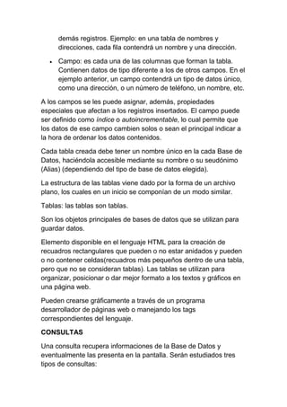 demás registros. Ejemplo:en una tabla de nombres y direcciones, cada fila contendrá un nombre y una dirección. Campo: es cada una de las columnas que forman la tabla. Contienen datos de tipo diferente a los de otros campos. En el ejemplo anterior, un campo contendrá un tipo de datos único, como una dirección, o un número de teléfono, un nombre, etc. A los campos se les puede asignar, además, propiedades especiales que afectan a los registros insertados. El campo puede ser definido como índice o autoincrementable, lo cual permite que los datos de ese campo cambien solos o sean el principal indicar a la hora de ordenar los datos contenidos. Cada tabla creada debe tener un nombre único en la cada Base de Datos, haciéndola accesible mediante su nombre o su seudónimo (Alias) (dependiendo del tipo de base de datos elegida). La estructura de las tablas viene dado por la forma de un archivo plano, los cuales en un inicio se componían de un modo similar. Tablas: las tablas son tablas. Son los objetos principales de bases de datos que se utilizan para guardar datos. Elemento disponible en el lenguaje HTML para la creación de recuadros rectangulares que pueden o no estar anidados y pueden o no contener celdas(recuadros más pequeños dentro de una tabla, pero que no se consideran tablas). Las tablas se utilizan para organizar, posicionar o dar mejor formato a los textos y gráficos en una página web. Pueden crearse gráficamente a través de un programa desarrollador de páginas web o manejando los tags correspondientes del lenguaje. CONSULTAS Una consulta recupera informaciones de la Base de Datos y eventualmente las presenta en la pantalla. Serán estudiados tres tipos de consultas: