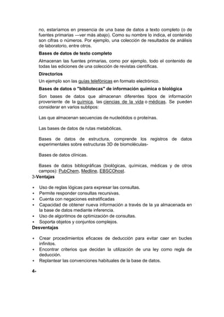 Este documento describe los conceptos básicos de las bases de datos, incluyendo sus tipos, ventajas y desventajas, y características. Explica que una base de datos es un conjunto de datos almacenados sistemáticamente para su uso futuro, y que existen diferentes tipos como bases de datos estáticas, dinámicas, bibliográficas y de texto completo. También destaca algunas ventajas como la capacidad de respuesta a consultas recursivas y obtención de nueva información, así como posibles desventajas como la dificultad de evitar
