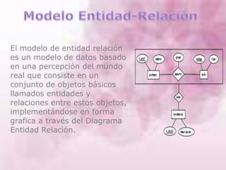 El modelo de entidad relación es un modelo de datos basado en objetos del mundo real llamados entidades y las relaciones entre ellas. Las entidades se describen con atributos y se agrupan en conjuntos de entidades similares. Las relaciones describen interacciones entre entidades y pueden ser de uno a uno, uno a varios o varios a varios. El proceso de diseño de una base de datos usando este modelo implica determinar la finalidad, organizar la información, dividirla en tablas, definir claves, relaciones y aplicar normalización.