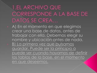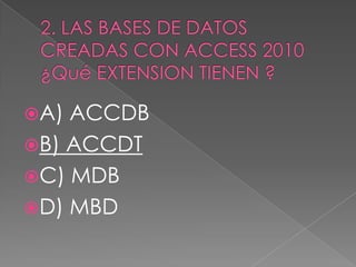 Este documento contiene preguntas y respuestas sobre conceptos básicos relacionados con Microsoft Access, incluyendo el tipo de archivo de base de datos (.ACCDB vs .MDB), la ubicación del área de trabajo, cómo abrir y cerrar bases de datos, y funciones básicas como tablas, consultas, formularios y macros.