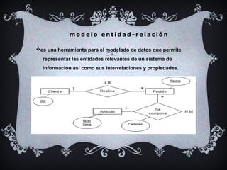 Este documento describe el modelo entidad-relación y el modelo relacional de bases de datos. Explica que el modelo entidad-relación permite representar las entidades y relaciones de un sistema de información, mientras que el modelo relacional implementa bases de datos planificadas mediante tablas interrelacionadas. Además, detalla tres tipos de relaciones entre tablas: uno a varios, uno a uno, y varios a varios.