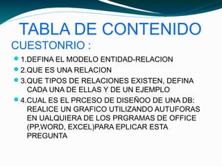 El documento resume los conceptos clave de las bases de datos, incluyendo: 1) El modelo entidad-relación representa las entidades y sus interrelaciones de un sistema de información. 2) Una relación describe la dependencia entre entidades y permite asociarlas. 3) Existen relaciones uno a uno, uno a varios y varios a varios, cada una con ejemplos. 4) El proceso de diseño de una base de datos incluye determinar su finalidad, organizar la información, dividirla en tablas, definir campos, claves y relaciones, y aplicar